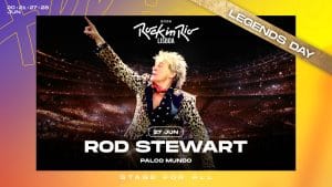 Ao Palco Mundo, sobe Rod Stewart, uma das maiores lendas da história da música. O artista regressa ao festival depois de ter atuado na primeira edição do Rock in Rio, em 1985 e no Rock in Rio Lisboa, em 2008.